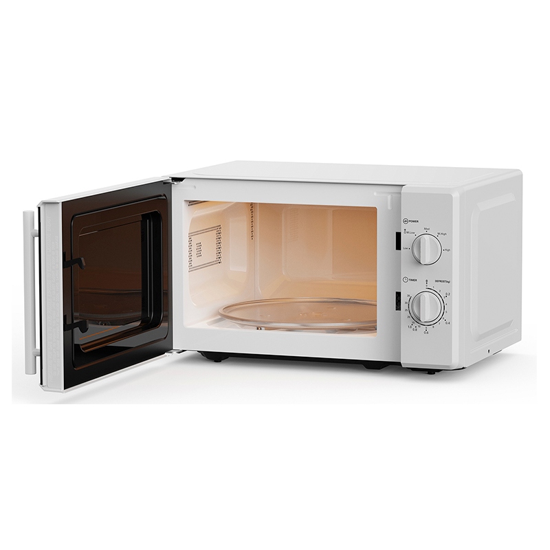 Mekanisk mikrobølgeovn 20L. 700W. Kompakt mekanisk mikrobølgeovn med 5 effekt-trinn inkludert tinefunksjon. 30 minutters mekanisk timer med klokkefunktion. Roterende glasstallerken - 24,5 cm i diameter.