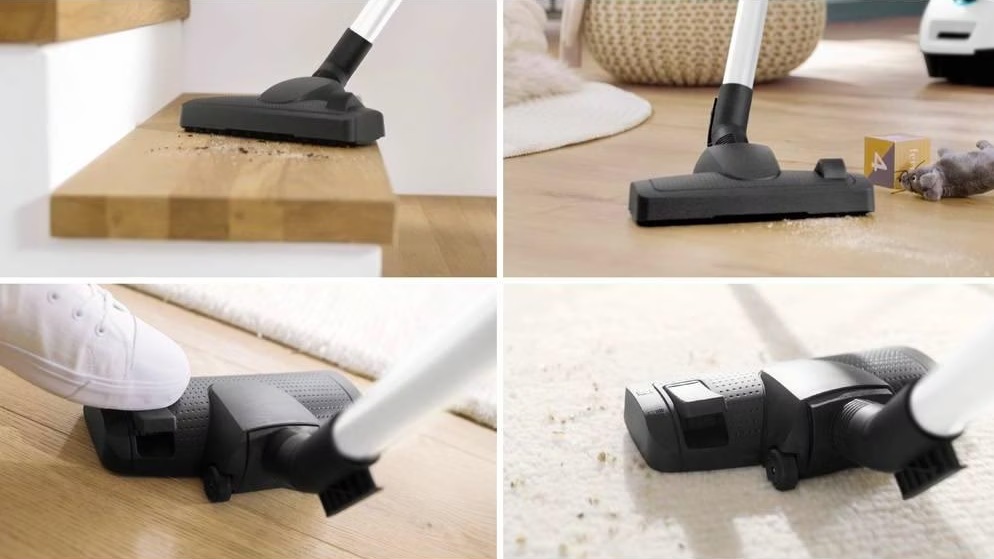 - Flere munnstykker for fleksibel rengjøring av tepper, gulv og smale spalter.