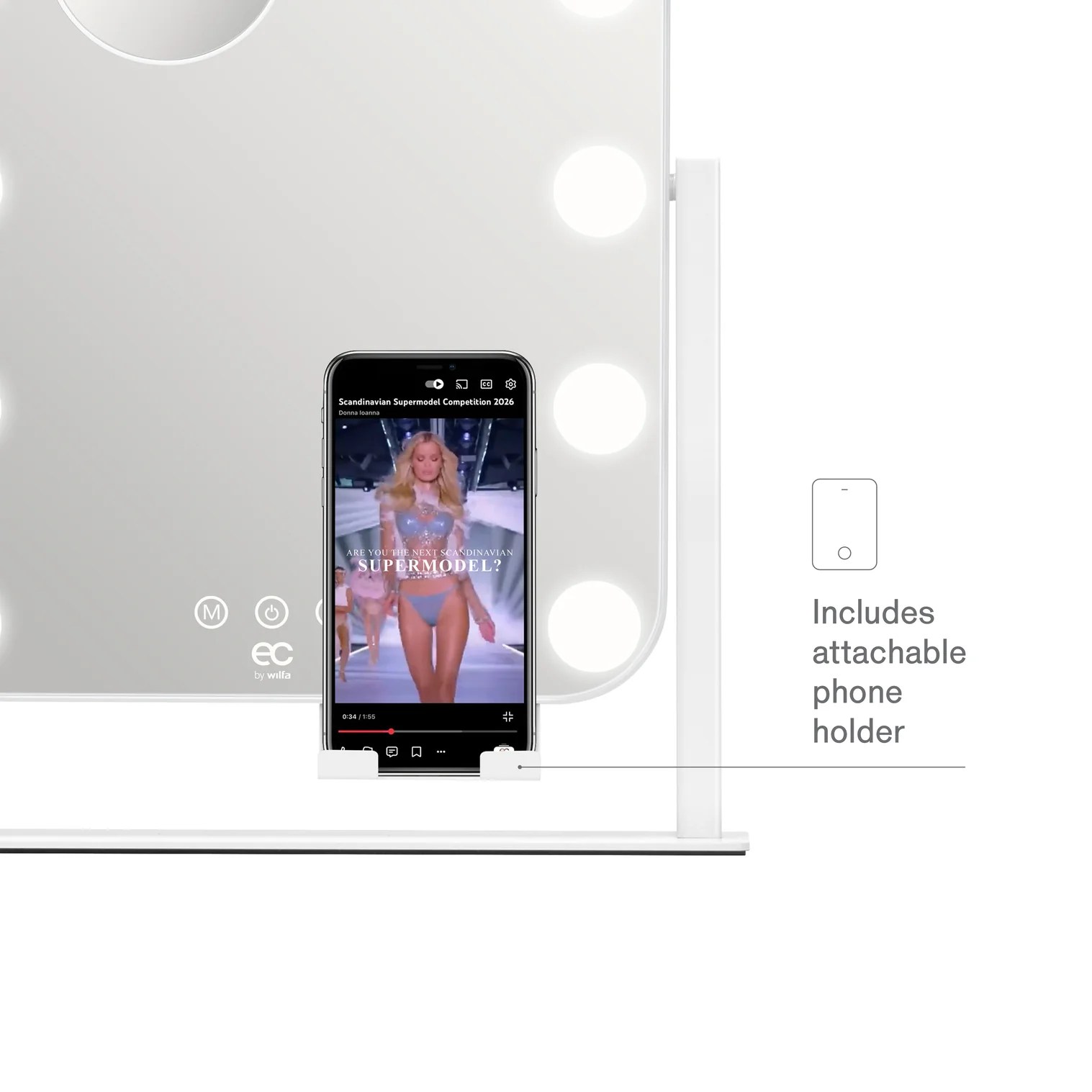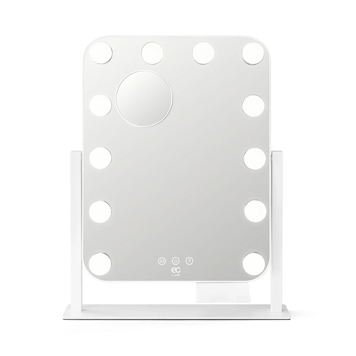 EC by Wilfa Shine er et oppladbart sminkespeil i klassisk Hollywood-stil med 12 LED-lys og trinnløs lysjustering. Det kan brukes mens det lades og har et 1200 mAh-batteri. En full opplading tar 2,5–3 timer og gir opptil 10 dagers bruk, beregnet med ca. 30 minutter per dag, avhengig av valgt lysstyrke. Det kompakte formatet gjør det enkelt å plassere på sminkebord, skrivebord eller hylle.