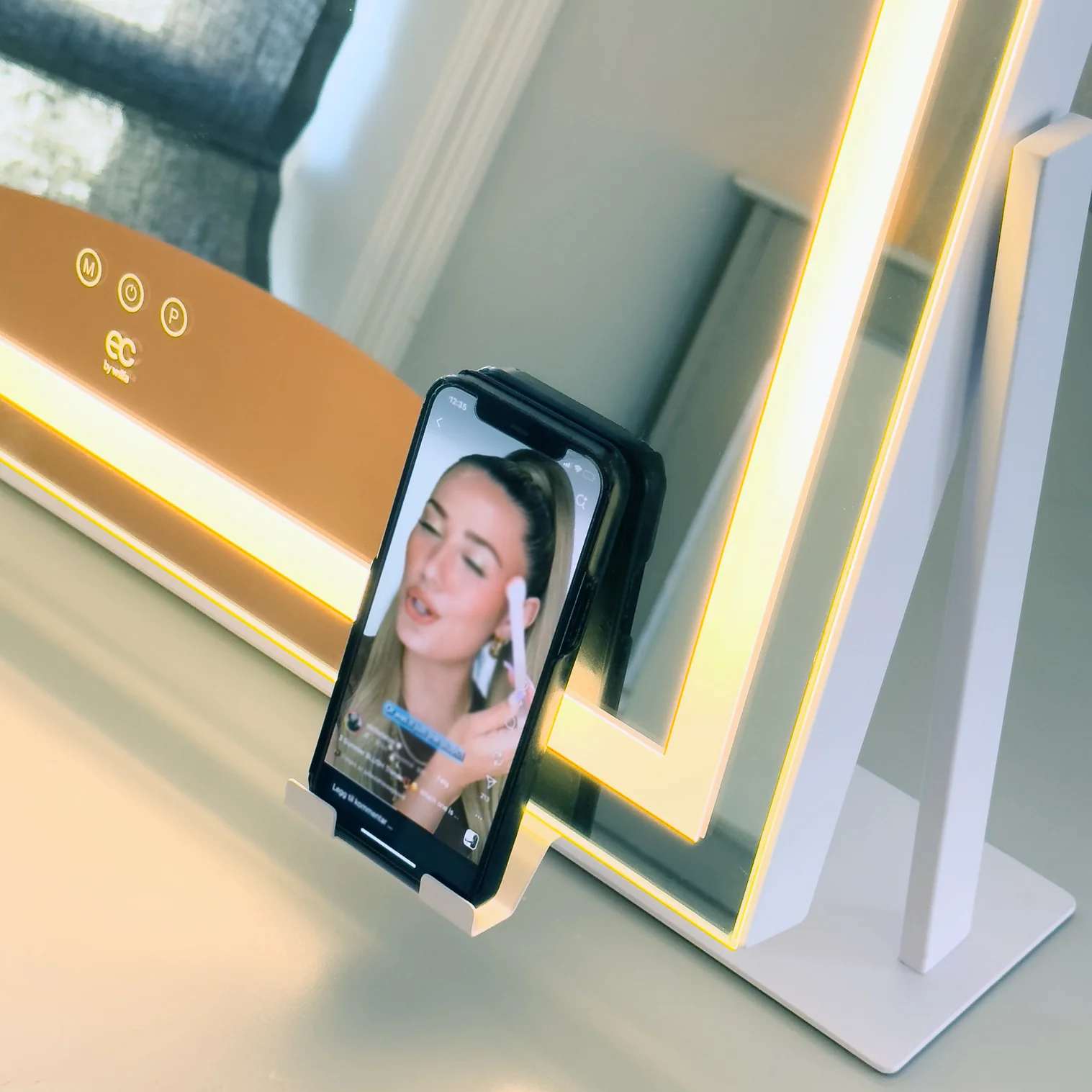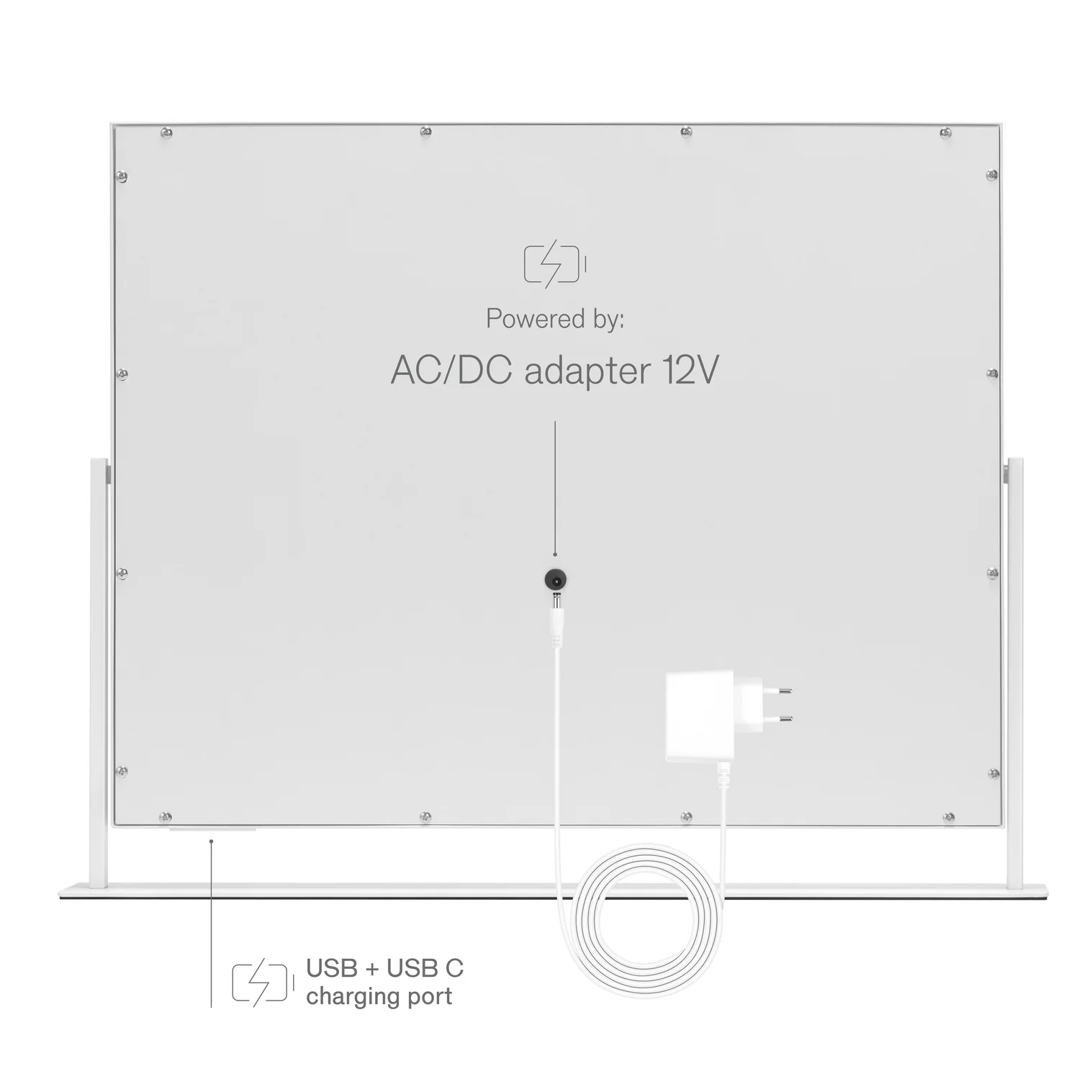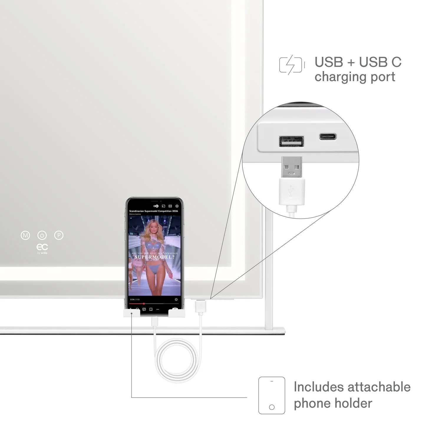 Innebygde USB- og USB-C-porter lar deg lade enhetene dine mens du gjør deg klar. Den medfølgende mobilholderen kan enkelt festes på speilet for tilgang til instruksjoner, musikk eller videosamtaler - rett foran deg.