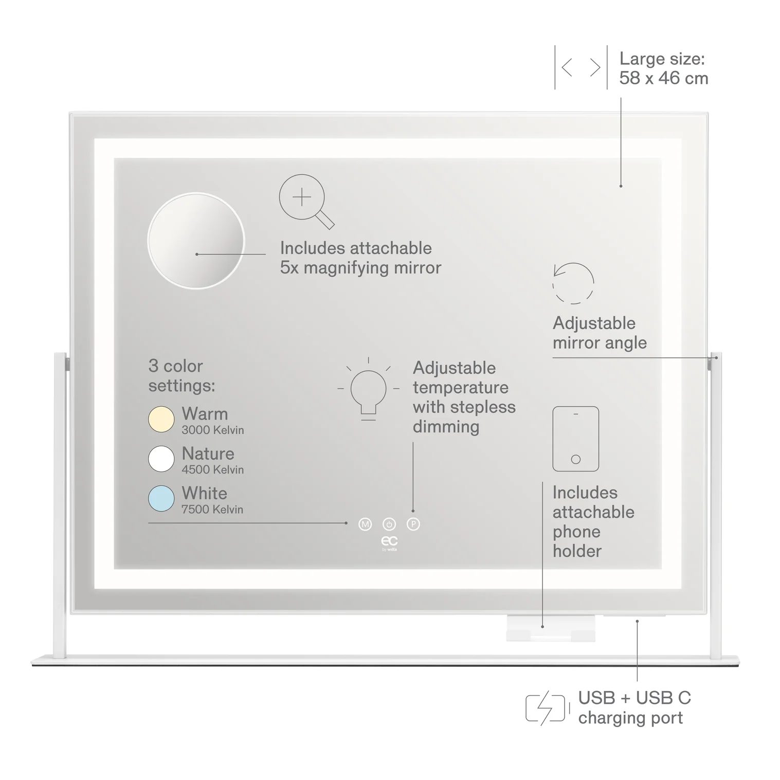 Med justerbar vinkel på speilet kan du enkelt tilpasse EC Sparkle slik at du alltid får den beste synsvinkelen, enten du sitter, står eller ønsker å fokusere på detaljer. Dette gir optimal komfort og presisjon under sminkingen.