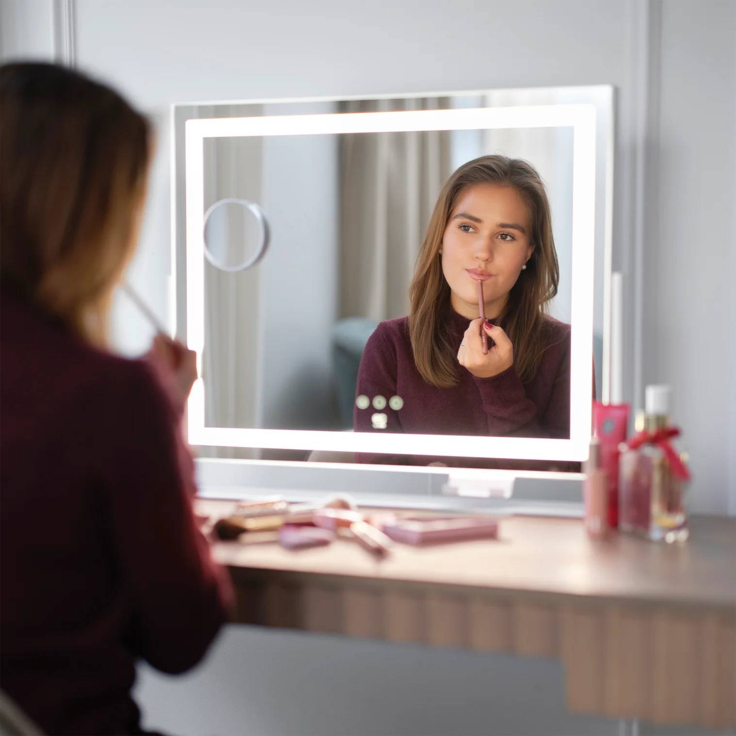 Lyset er integrert i speilets ramme og omkranser hele speilflaten. Du får jevn belysning uten skygger, perfekt for nøyaktig sminke, hårstyling eller hudpleie. Velg mellom tre fargetemperaturer: