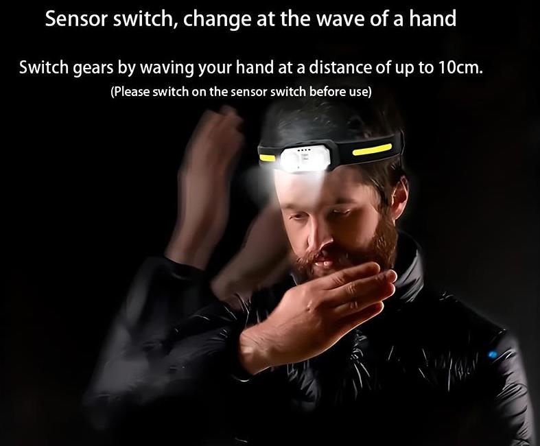 Robust og lett oppladbar LED hodelykt med sidelys og 5 funksjonsmodi: XPE100% og 50% / WCOB 100% / rødt lys / langt trykk SOS. IPX4-sprutsikker. Bevegelses-sensor for skifte av modus. Lades med USB-C.