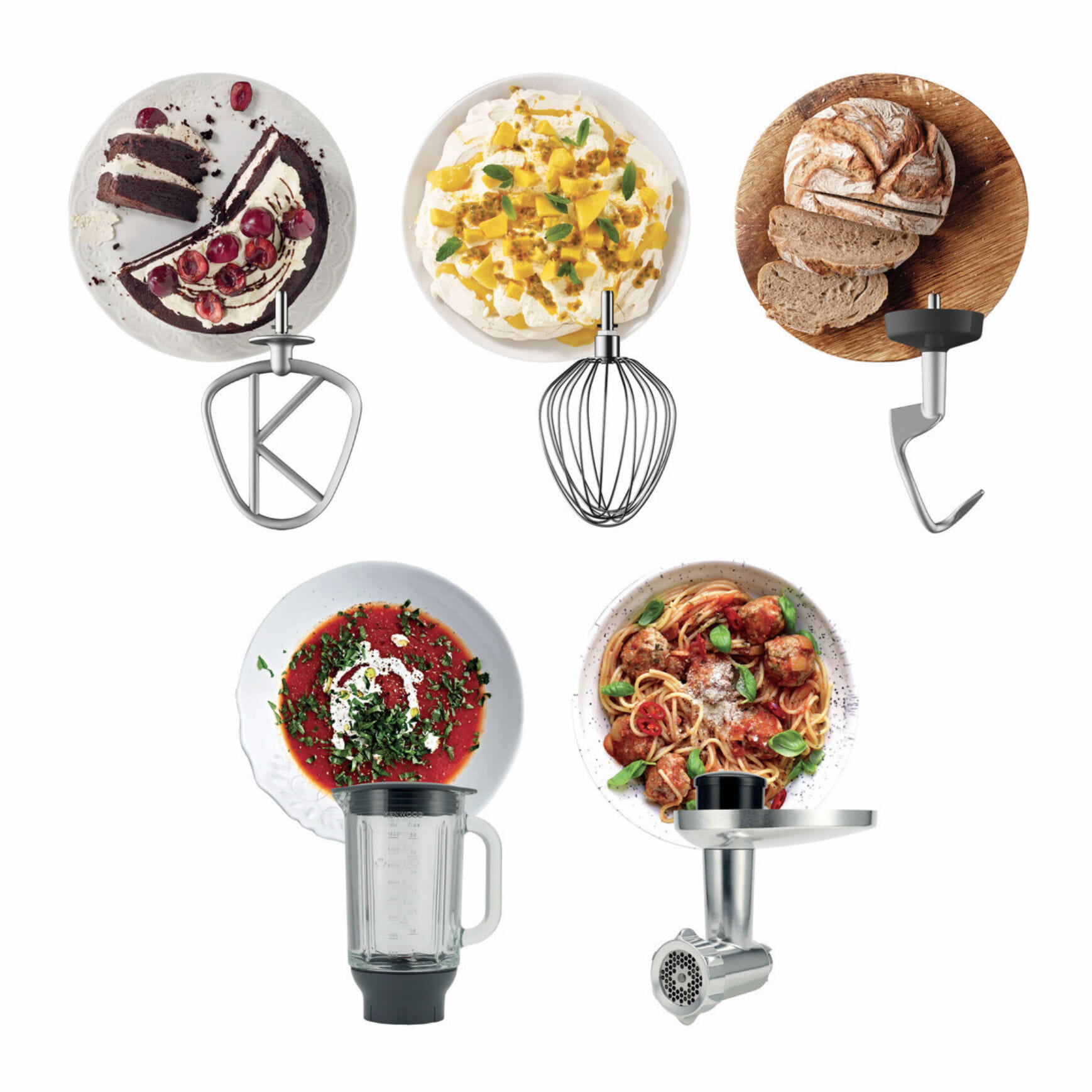Den universelle maskinen leveres med en 6,7 liters stålbolle, en K-mikser, en kulemikser og en deigkrok. I tillegg får du en kjøttkvern for å lage pasta og en 1,6-liters varmebestandig ThermoResist-blender i glass for varme supper og friske smoothies.
