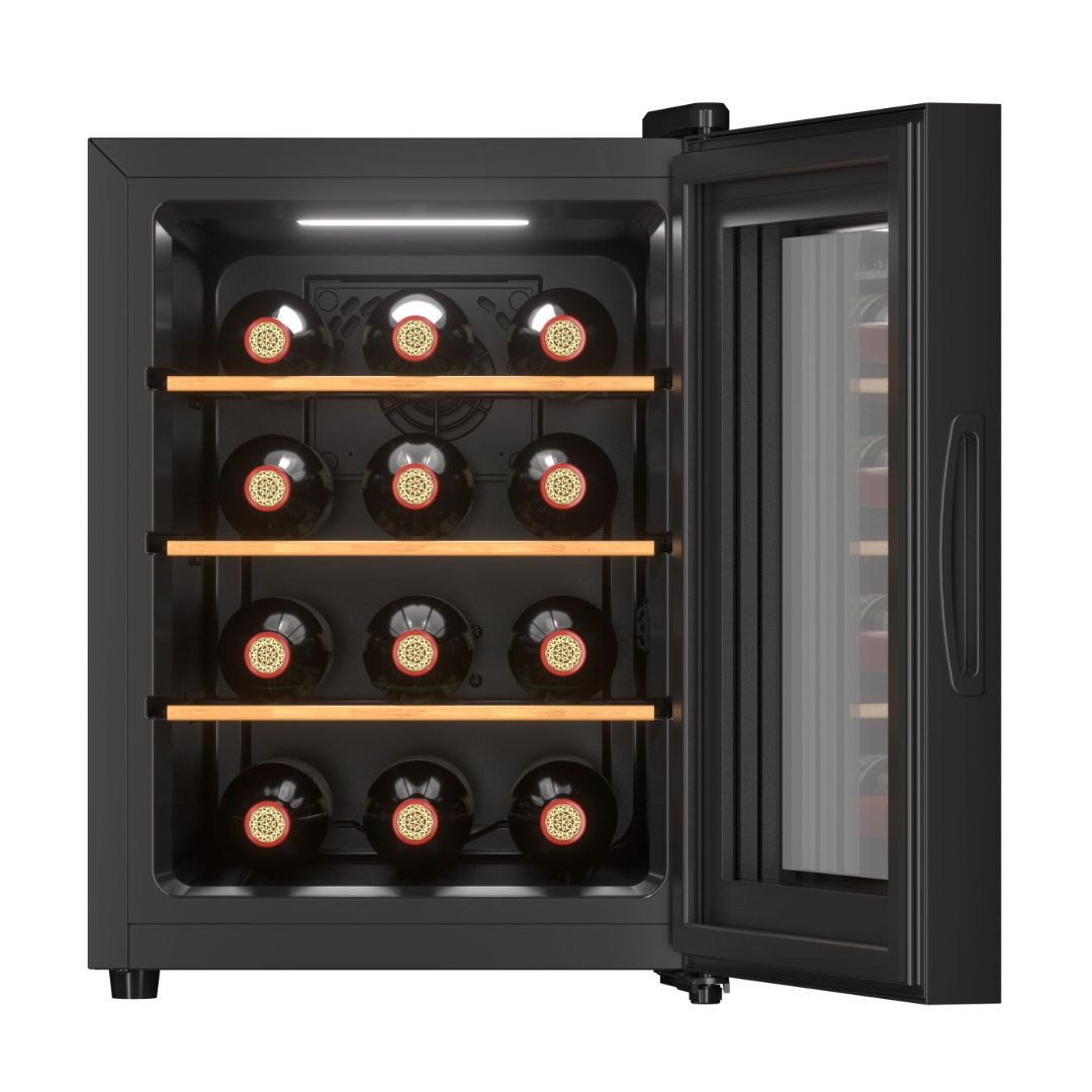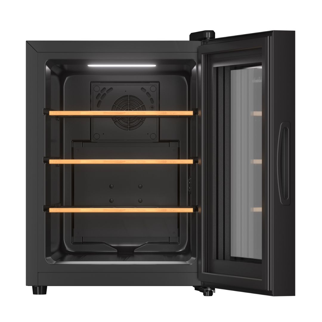 Vinskapet er utstyrt med UV-beskyttet glassdør og integrert touch-panel i front. Det har tre ståltrådhyller med fronter i tre og kjølig hvitt LED-lys. Det stilrene designet i svart og antrasittgrått passer perfekt inn i moderne interiør.