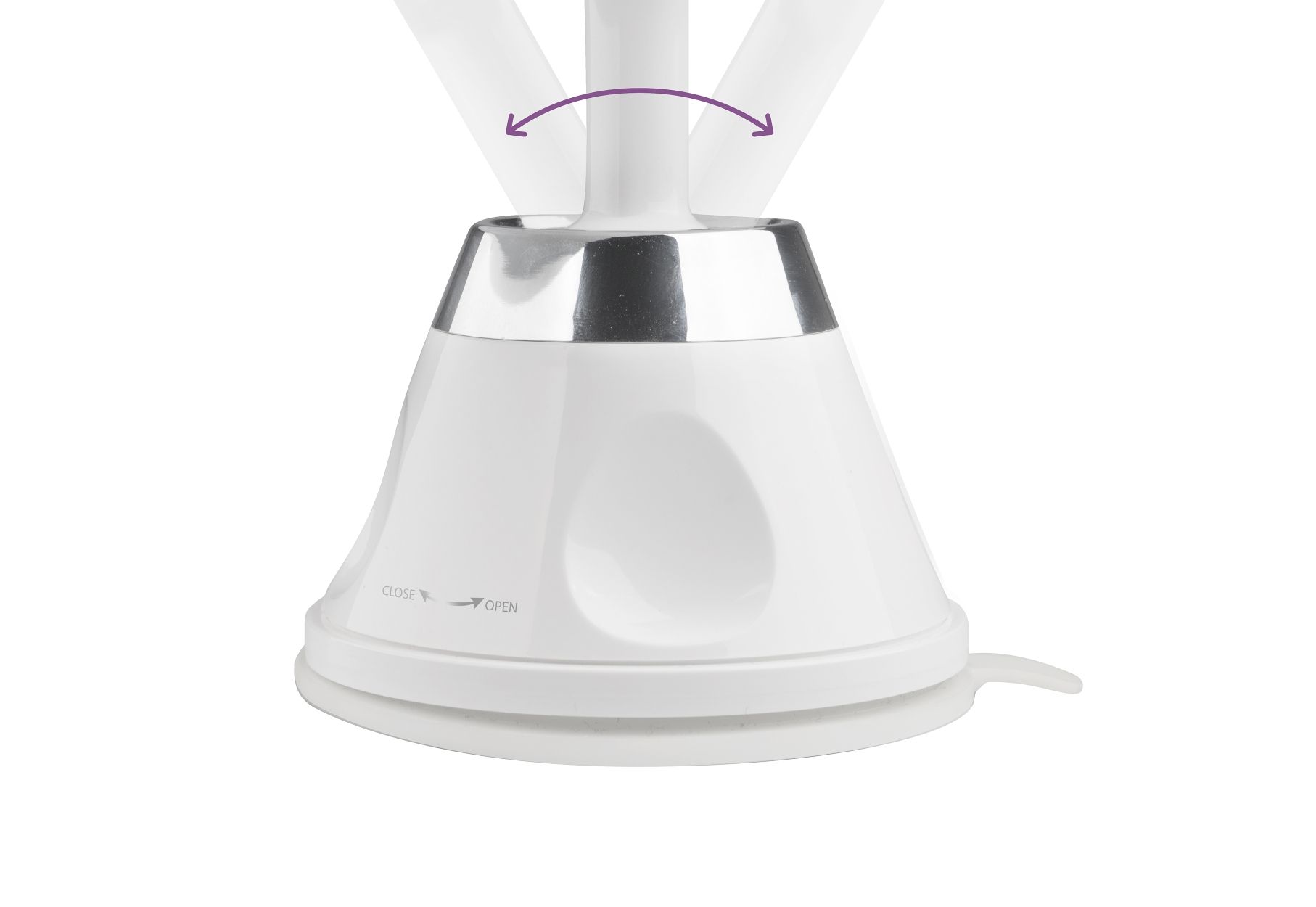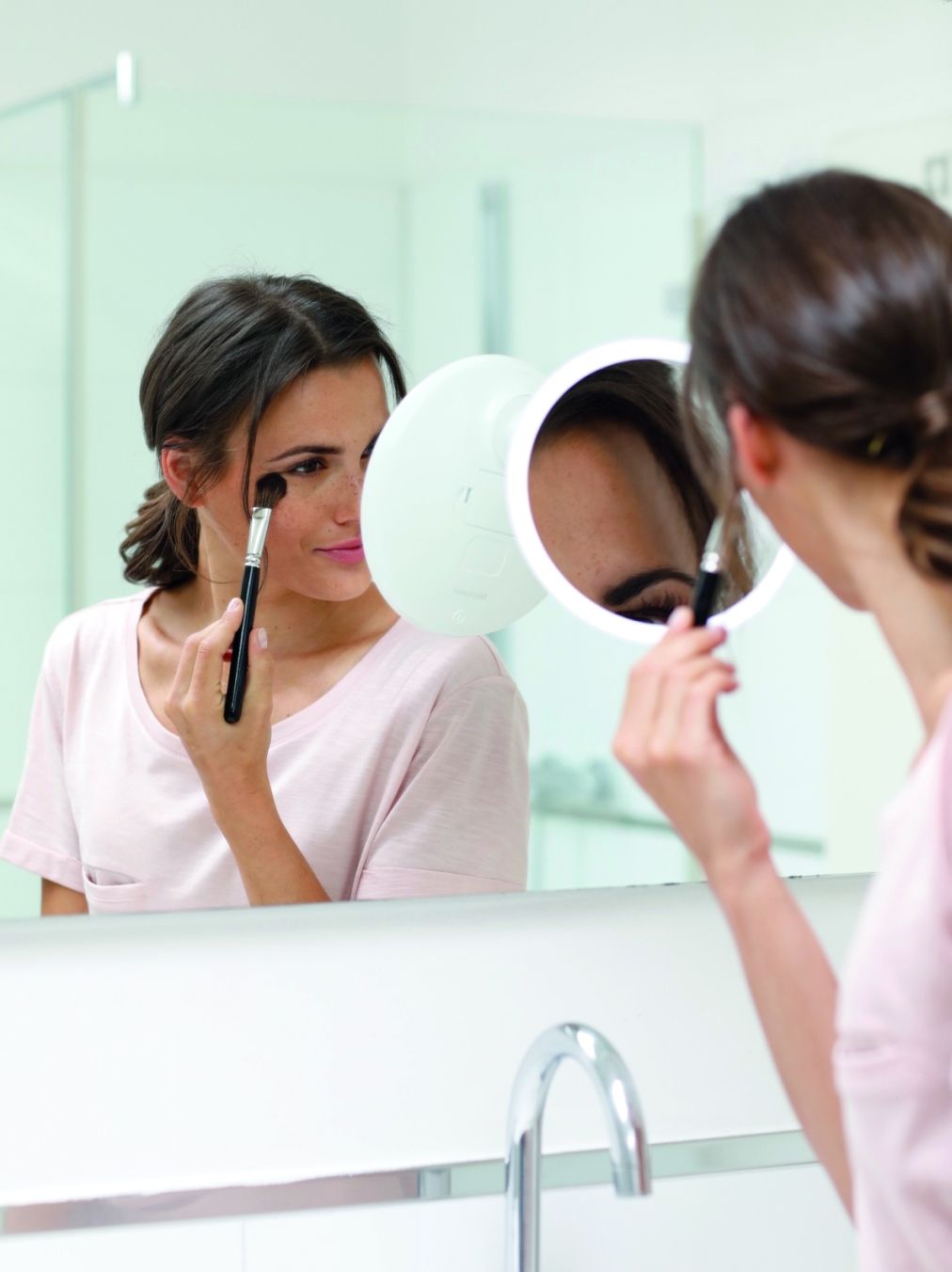 Sminkespeilet CM 850, med sugekopp, overbeviser med sin kraftige LED-belysning og den ekstra store speiloverflaten på 19 cm i diameter. Takket være den høye sugekraften fester den seg til alle glatte overflater, for eksempel baderomsfliser eller større veggspeil.
