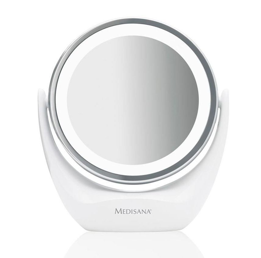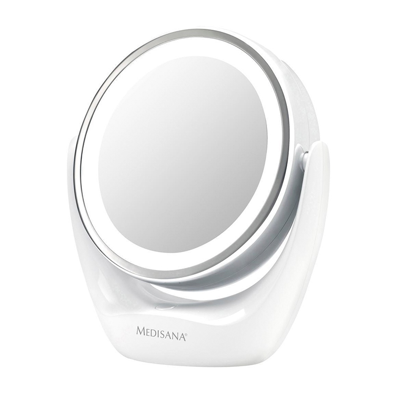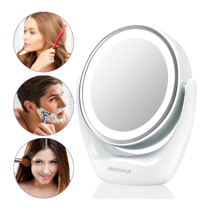 Kosmetisk speil med belysning og 2 speil med sving på. Opptil 5x forstørrelse og med en ring av led lamper for en meget god belysning! I høykvalitets chrome finnish. Diameter 12 cm. Inluderer batterier. Stabil base/bordsokkel.