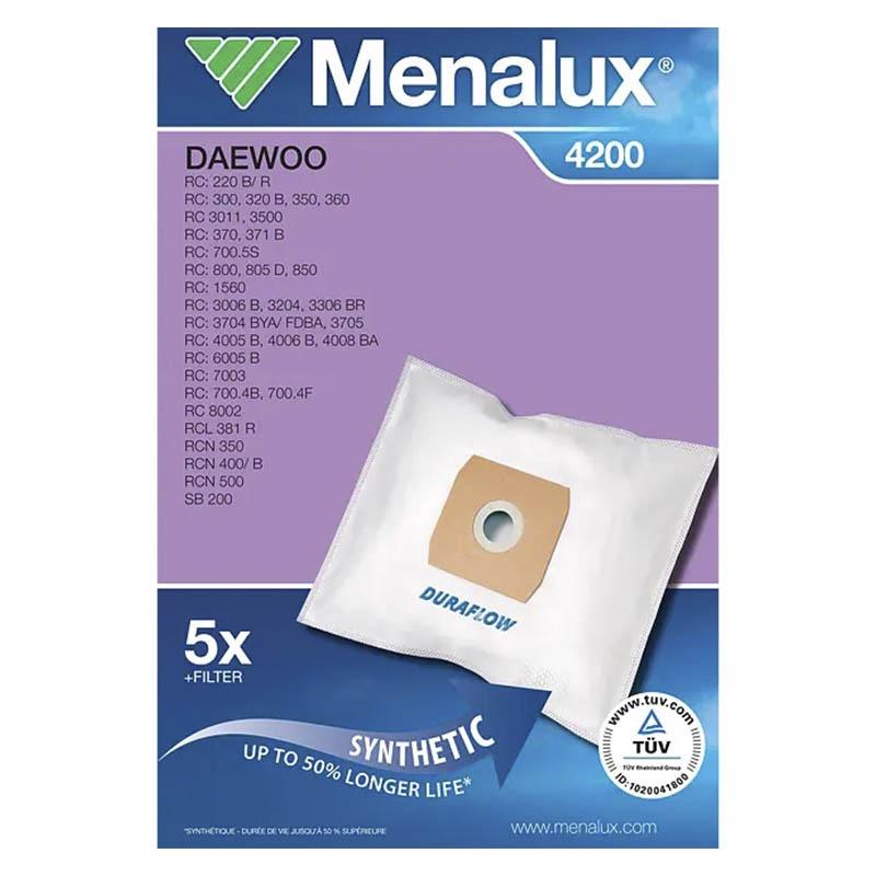 Menalux støvsugerposer 4200 passer støvsugere fra Daewoo. Pakken inneholder 5 stk. syntetiske støvsugerposer med filter.