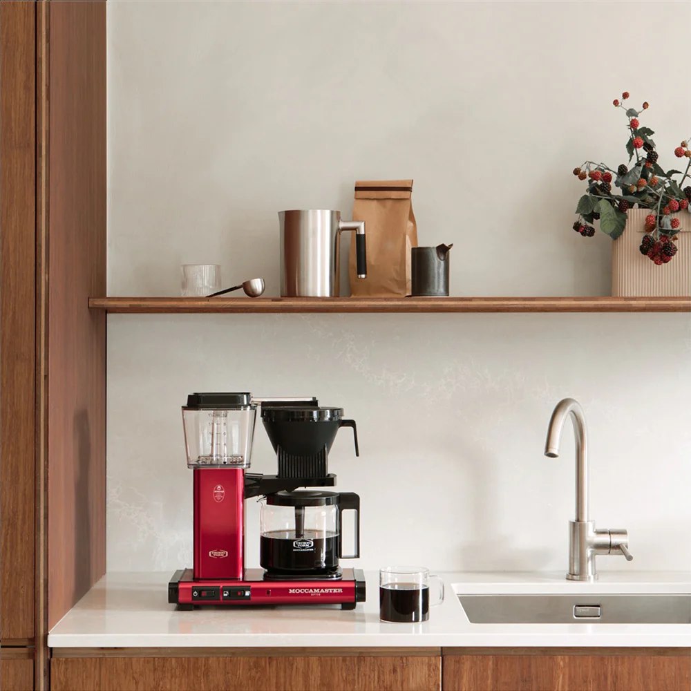 Toppmodellen fra Moccamaster tilbyr alle tilgjengelige funksjoner, inkludert en unik funksjon for å trakte enten 2-5 kopper eller 5-10 kopper. Dette gjør det mulig for deg å trakte perfekt kaffe, uavhengig av mengden. Den kan lage en full kanne (1,25 liter) kaffe på bare 6 minutter.