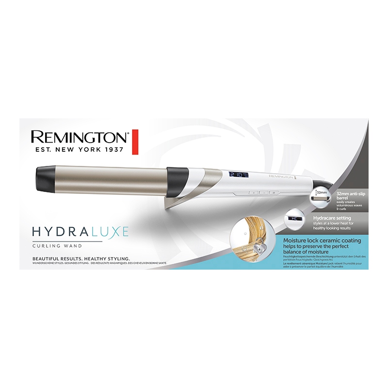 Remington HYDRAluxe CI89H1 krølltang for store krøller 32mm. Hydracare har temperatur innstilling for beskyttelse av håret. Microbalasam tilføres håret ved bruk og gir fuktbevarende beskyttelse. Ioniserende. 30 sekunders oppvarmings tid.