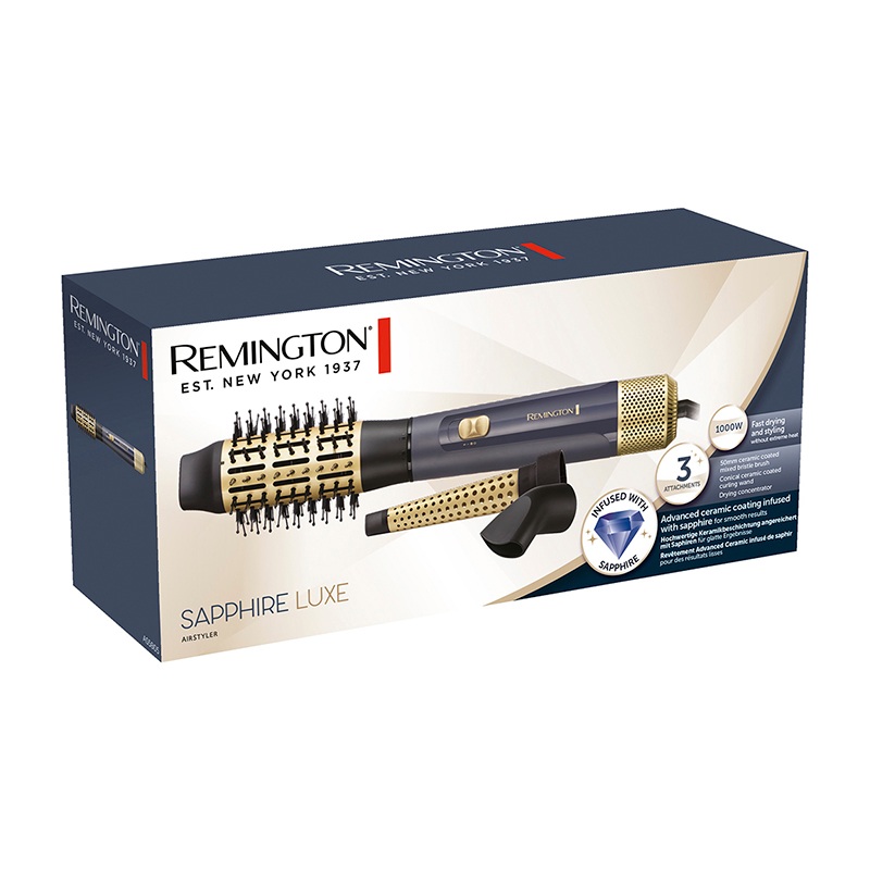 Med Remington Sapphire Luxe Airstyler vil du, uansett personlig stil, få vakkert glatt hår takket være det avanserte keramiske belegget med safir. Ionisk kondisjonering motvirker statisk elektrisitet mens du tørker og styler. Med tre tilbehør kan du enkelt lage din signaturlook. Den blandede børsten er flott for å skape volum ved røttene og forme mer strukturerte stiler, mens det koniske keramiske krøllfestet skaper vakre, naturlige krøller.
