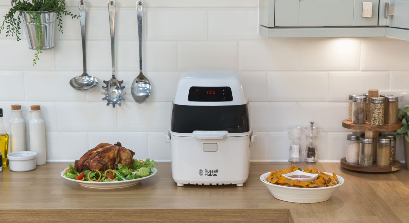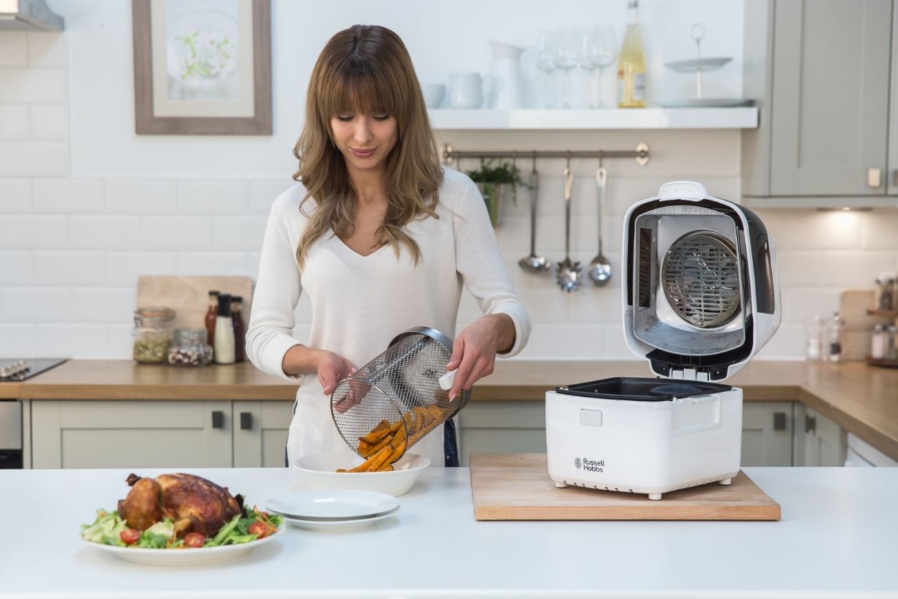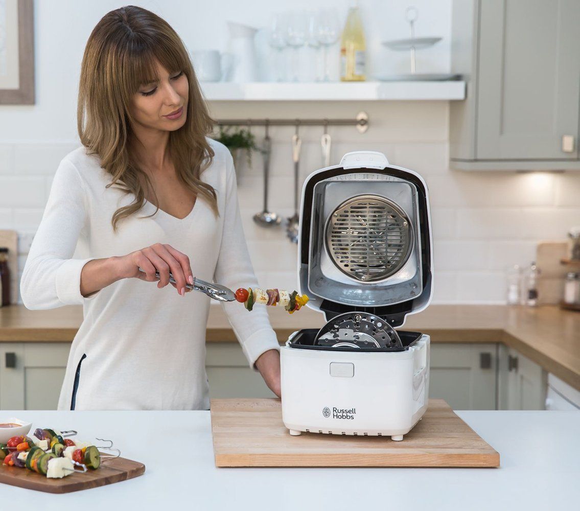 Varmlufts frityrkoker som sparer deg for masse kalorier. Denne nye konstruksjonen fra Russell Hobbs har en roterende beholder som snurrer maten din rundt så den blir jevnt stekt med halogen elementer. Denne luksus modellen har i tillegg grill og kebab spyd. Alle elementene inne i ovnen kan vaskes i oppvaskmaskin. Du kan bake, grille, riste steke eller fritere maten.