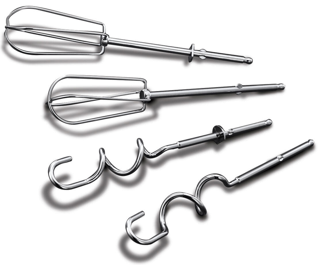Frigjøringsknapp gjør det lett å få løs tillbehøret. 2 stk. visper. 2 stk. deigkroker. Tilbehøret kan vaskes i oppvaskmaskin.
