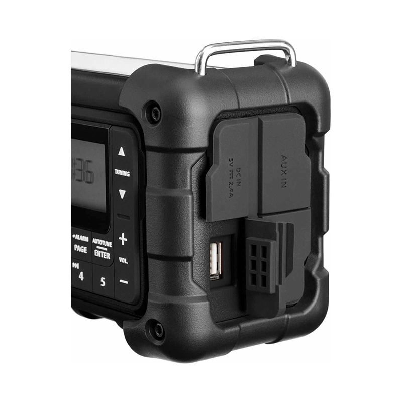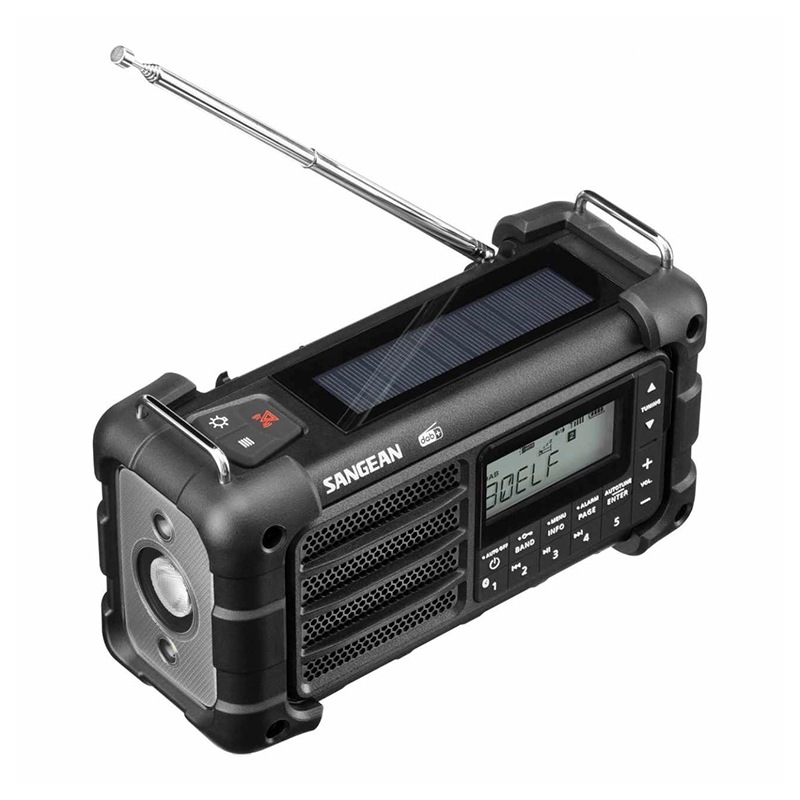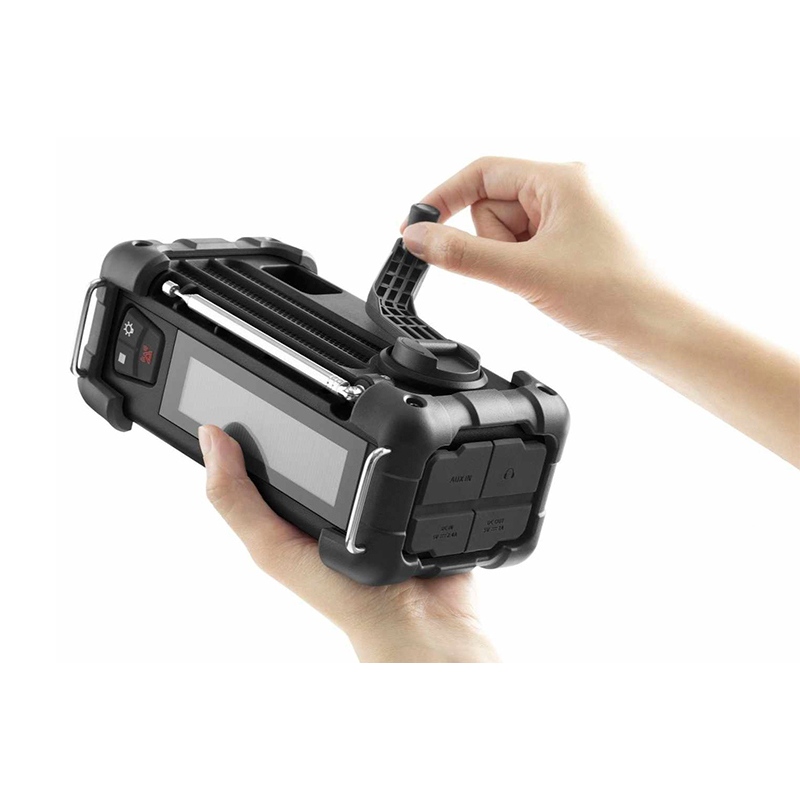 Drevet av håndsveiv/solenergi/DC-inngang (USB Type-C) til oppladbart batteri, justerbar 5-modus LED-lommelykt (Høy & Lav/Bred & Fokusert/Blinkende/SOS/Morsekode), rødt lys lommelykt for optimalt nattsyn, innebygd klokke, alarm-ur med 7 forskjellige summernivåer.