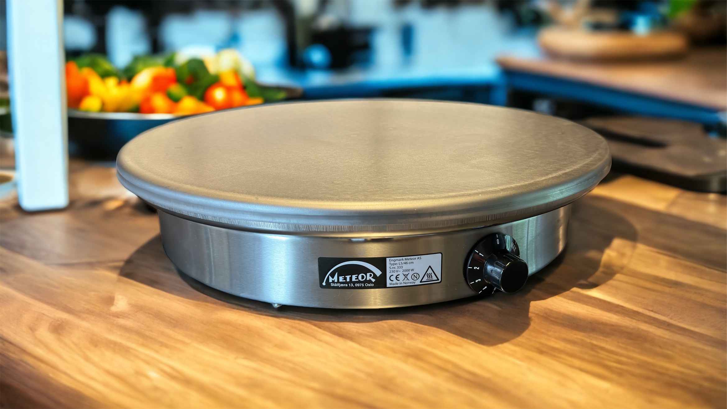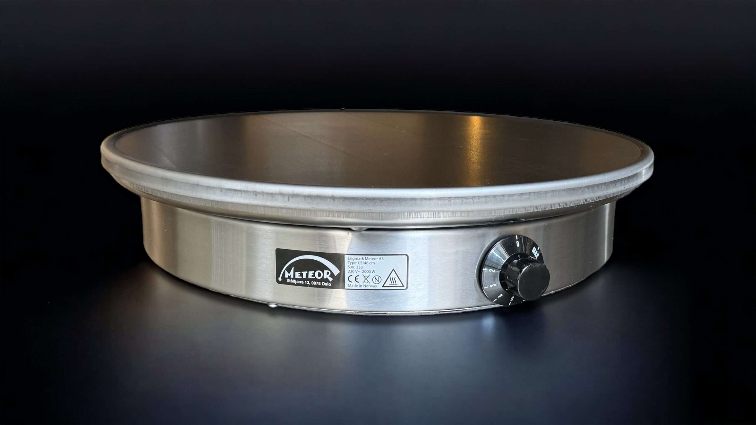 Den originale Meteor steketakke produsert i Oslo siden 1955. Topplate i karbonstål, chassis i børstet, rustfritt stål og keramisk varmeelement. En klassiker! 46 cm i diameter, 2000 watt, plan.