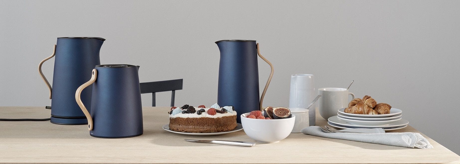 Emma vannkoker er en estetisk tiltalende grå stålkanne med et håndtak i bøketre som gir kannen et karakteristisk nordisk utseende. Den trådløse vannkokeren rommer 1,2 l og leveres med et avtakbart kalkfilter, sikkerhetsbryter for tørrkoking og slår seg av automatisk når vannet har kokt.