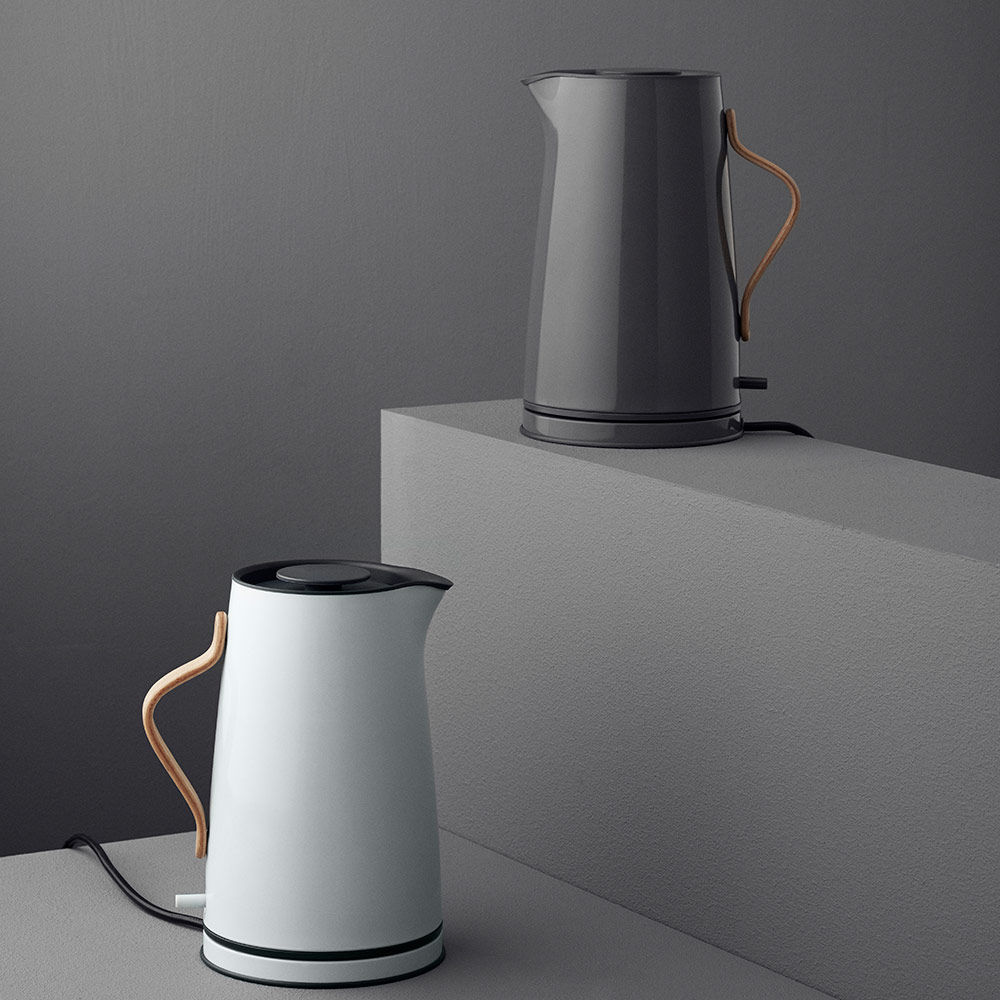 Emma vannkoker er en estetisk tiltalende grå stålkanne med et håndtak i bøketre som gir kannen et karakteristisk nordisk utseende. Den trådløse vannkokeren rommer 1,2 l og leveres med et avtakbart kalkfilter, sikkerhetsbryter for tørrkoking og slår seg av automatisk når vannet har kokt.