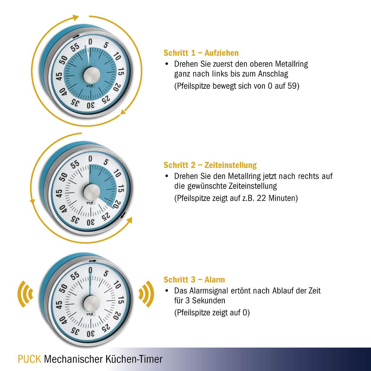 Den praktiske kjøkkenhjelperen, laget av rustfritt stål og gummibelagt plast, sørger ikke bare for det perfekte frokostegget, den minner deg også om kaken i ovnen eller pastaen i kjelen. Du kan sette den kontinuerlig i opptil 60 minutter med den mekaniske metallmekanismen.
